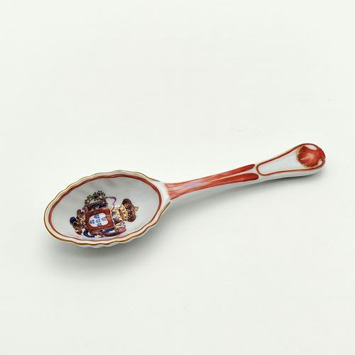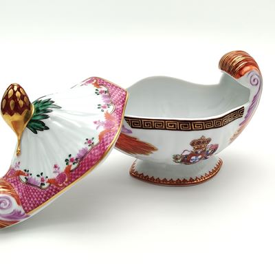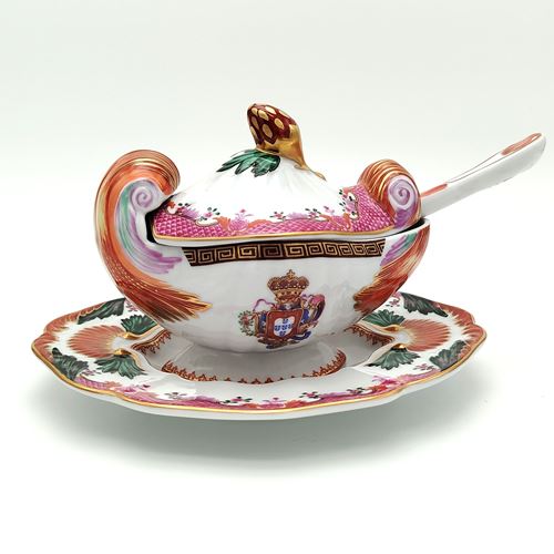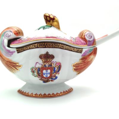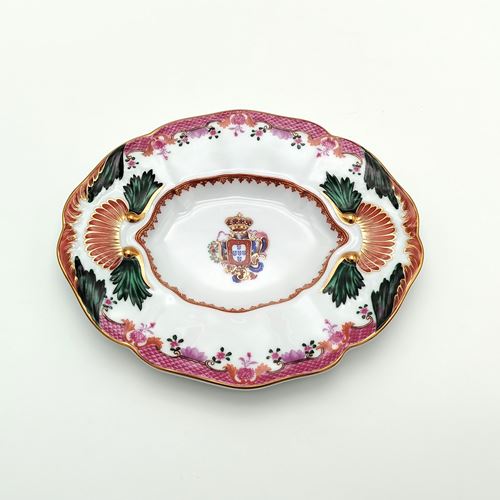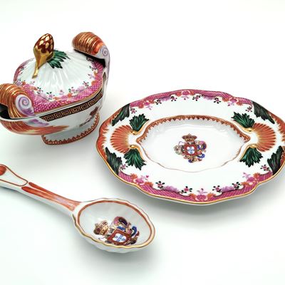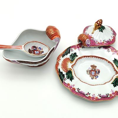 Conjunto de molheira com prato e colher em porcelana, com esmalte rosa e decorações douradas com relevos, ostenta as Armas Reais de D. Pedro III sobrepostas à Cruz da Ordem de Malta.