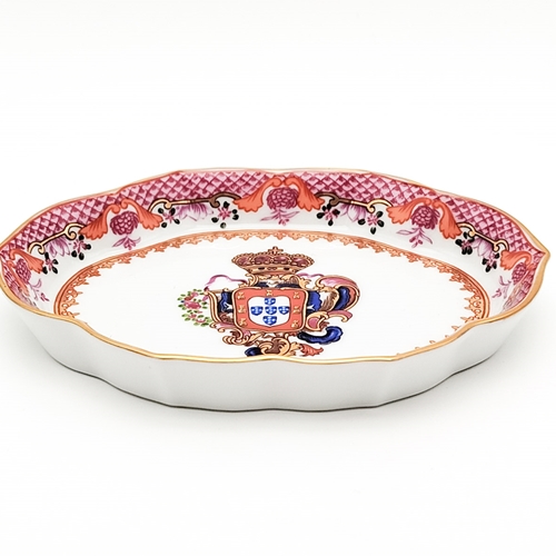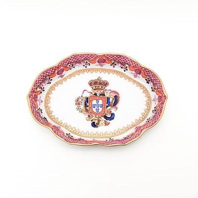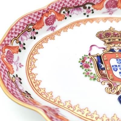 Covilhete com formato oval em porcelana, com esmalte rosa e decorações em dourado. Ostenta as Armas Reais de D. Pedro III sobrepostas à Cruz da Ordem de Malta.