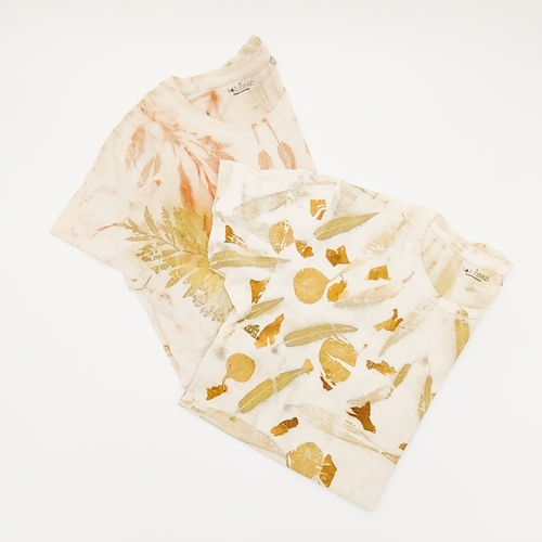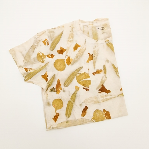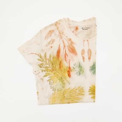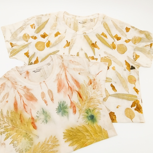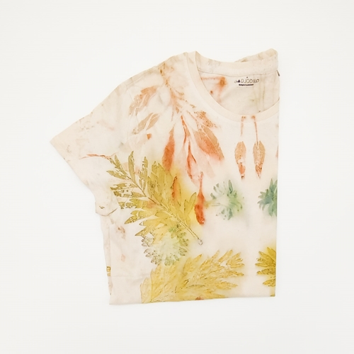 Tecido tingido com flores, folhas, cascas de árvores e metais usando a técnica de ecoprint, um método de impressão natural e ecológico.