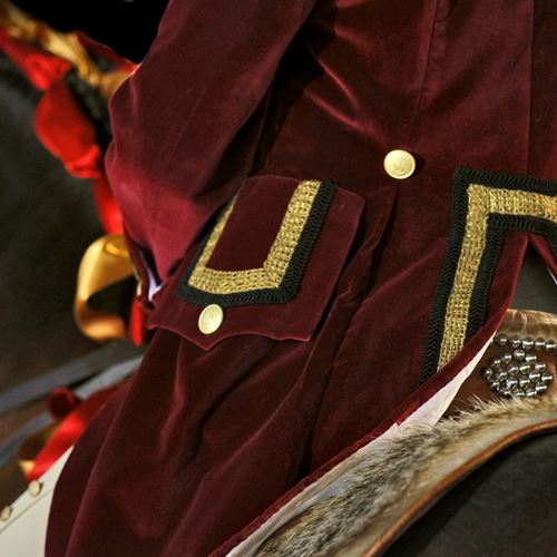 Lenço em seda, com o símbolo da Escola Portuguesa de Arte Equestre. Em tom bordeaux com bordo dourado, tal como usado nas fardas dos cavaleiros e dos xairéis de gala.