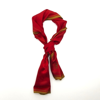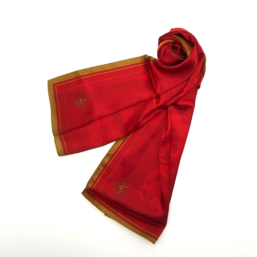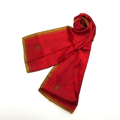 Écharpe em seda, com o emblema da Escola Portuguesa de Arte Equestre. Em tom bordeaux com bordo dourado, tal como usado nas fardas dos cavaleiros e dos xairéis de gala.