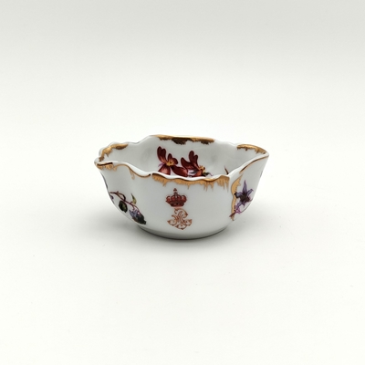 Cremeira polilobada em porcelana, com pequena asa lateral em forma de caule estilizado. Paredes interiores e exteriores com decoração polícroma e dourada, com composições de flores campestres e vegetalistas de diferentes cores e variedades, dispostas assimetricamente. Na parede exterior, monograma da rainha D. Maria Pia "MP" encimado por coroa fechada.