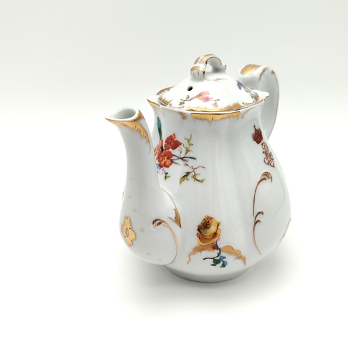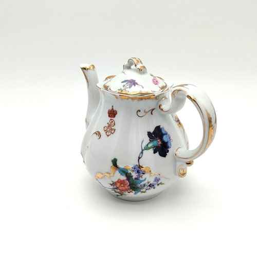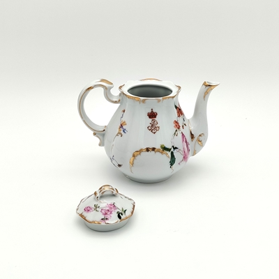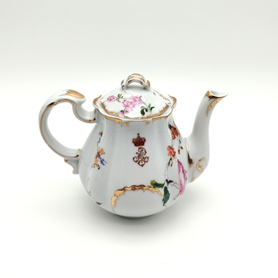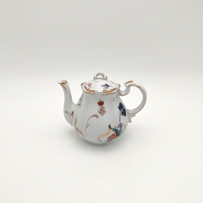 Bule em porcelana de forma piriforme. Decoração policroma e dourada com ramos de flores assimétricos diferentes e monograma da rainha D. Maria Pia "MP", encimado por coroa fechada. Bico alongado e encurvado na extremidade e asa moldada contracurvada. Bordo com relevos, retocados a ouro. Tampa recortada de encaixe com botão de preensão em forma de folha, cuja decoração é similar ao bule.