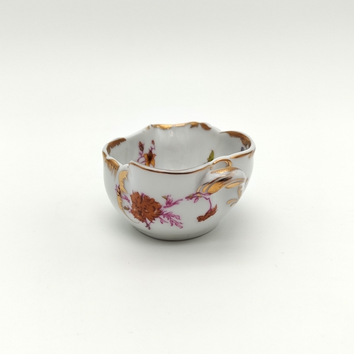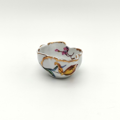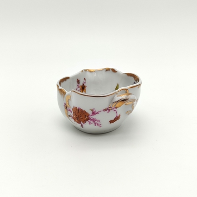 Cremeira polilobada em porcelana, com pequena asa lateral em forma de caule estilizado. Paredes interiores e exteriores com decoração polícroma e dourada, com composições de flores campestres e vegetalistas de diferentes cores e variedades, dispostas assimetricamente. Na parede exterior, monograma da rainha D. Maria Pia "MP" encimado por coroa fechada.