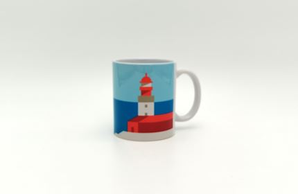 Caneca em cerâmica decorada com elementos icónicos da paisagem cultural de Sintra.