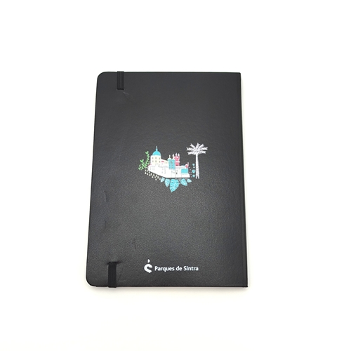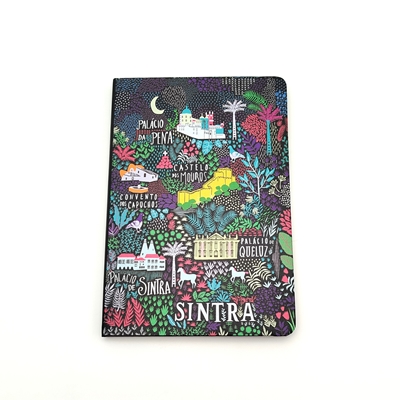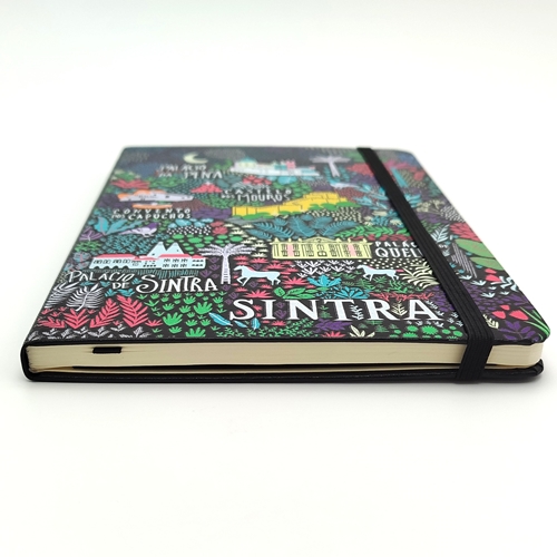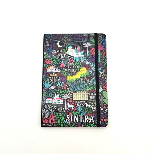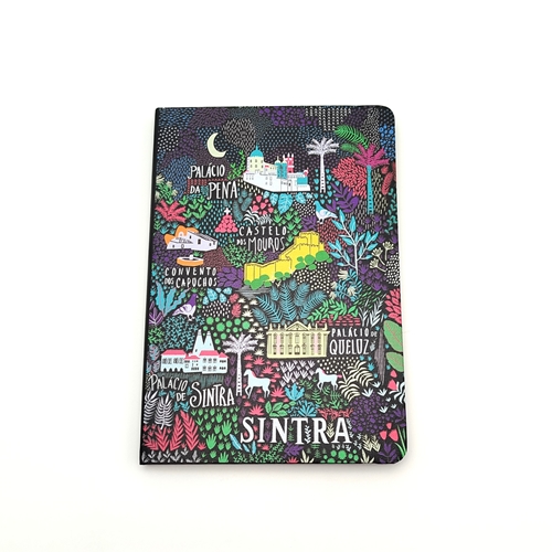 Bloco de notas, em tamanho A5, com padrão estilizado com a paisagem cultural de Sintra na capa.