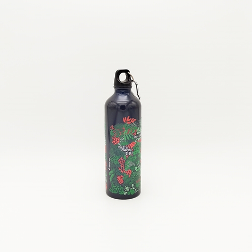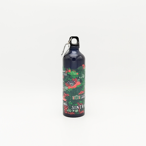 Garrafa em alumínio com mosquetão na tampa para facilitar o transporte.