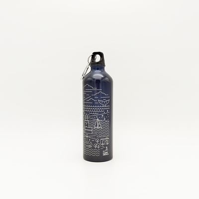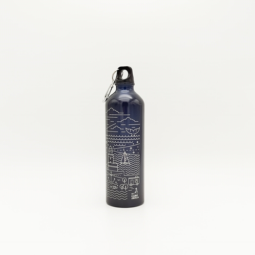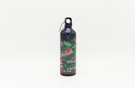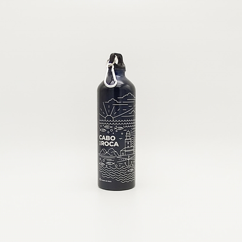 Garrafa em alumínio com mosquetão na tampa para facilitar o transporte.