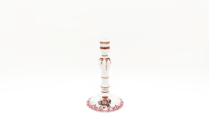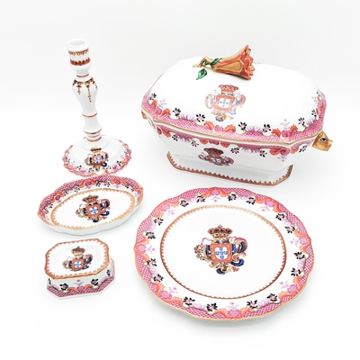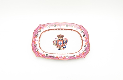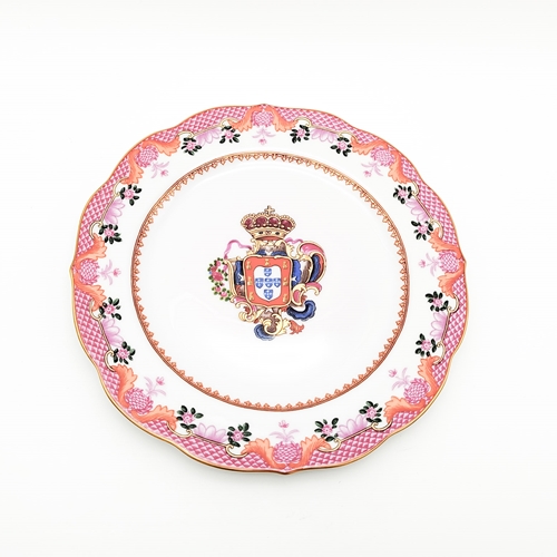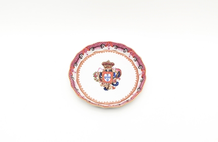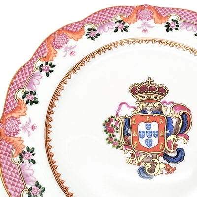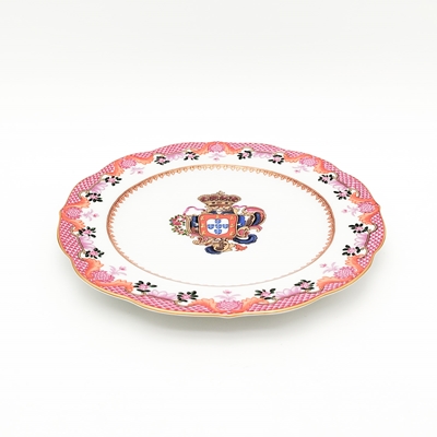 Prato em porcelana, com esmalte rosa e decorações em dourado. Apresenta as Armas Reais de D. Pedro III sobrepostas à Cruz da Ordem de Malta.