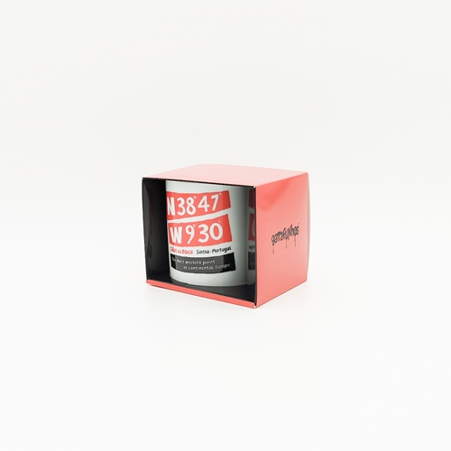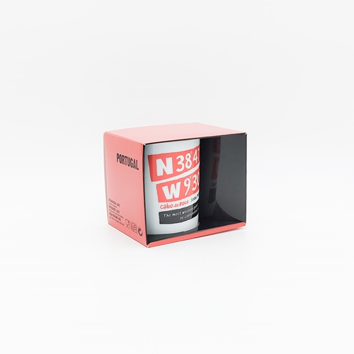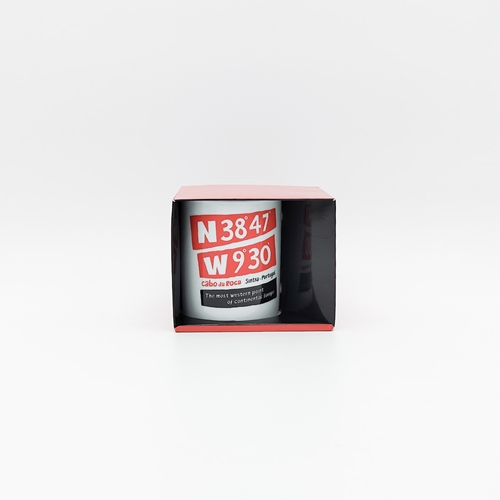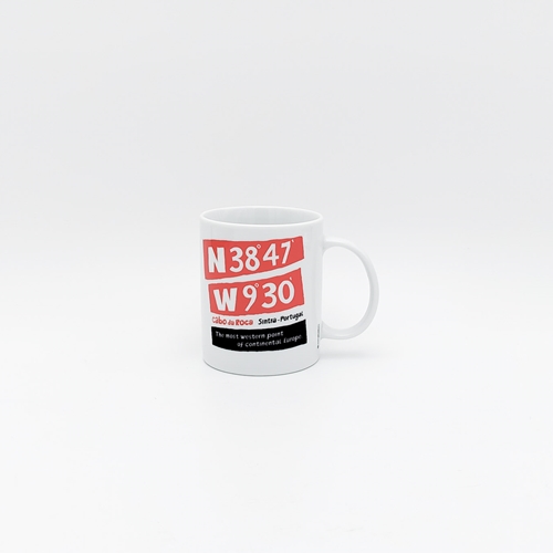 Caneca em cerâmica com as coordenadas geográficas do Cabo da Roca e a silhueta do farol.