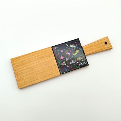 Tábua em madeira com azulejo decorativo com a representação dos ícones da paisagem de Sintra.
