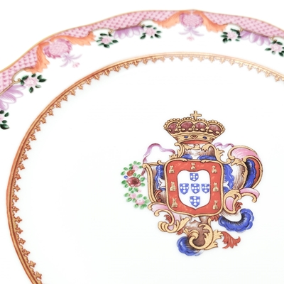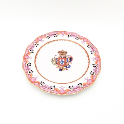Porcelana com esmalte rosa e decorações douradas, ostenta as Armas Reais de D. Pedro III sobrepostas à Cruz da Ordem de Malta.