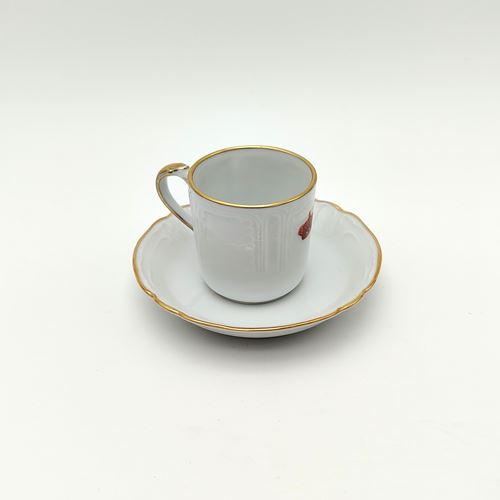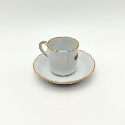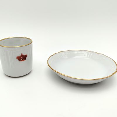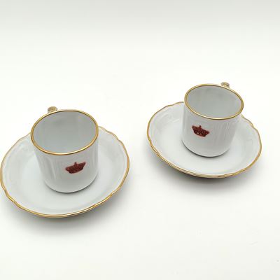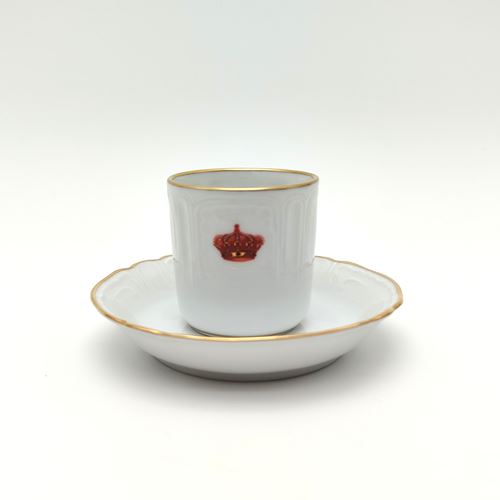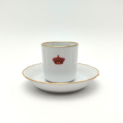 Chávena de café com pires em porcelana branca com um filete dourado no bordo e com coroa real a dourado, vermelho e verde.