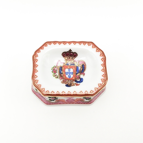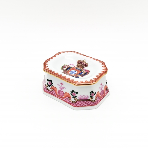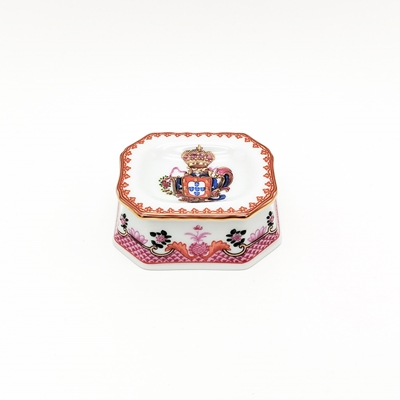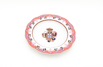 Em porcelana, com esmalte rosa e decorações em dourado. Ostenta as Armas Reais de D. Pedro III sobrepostas à Cruz da Ordem de Malta.