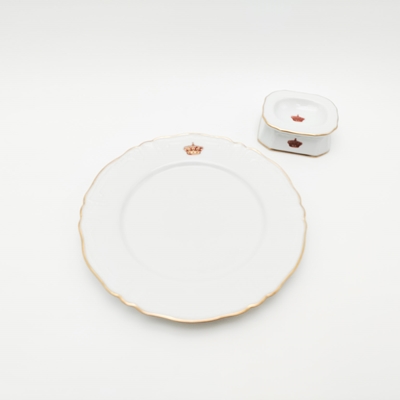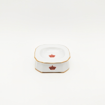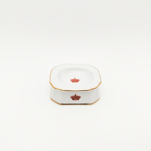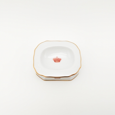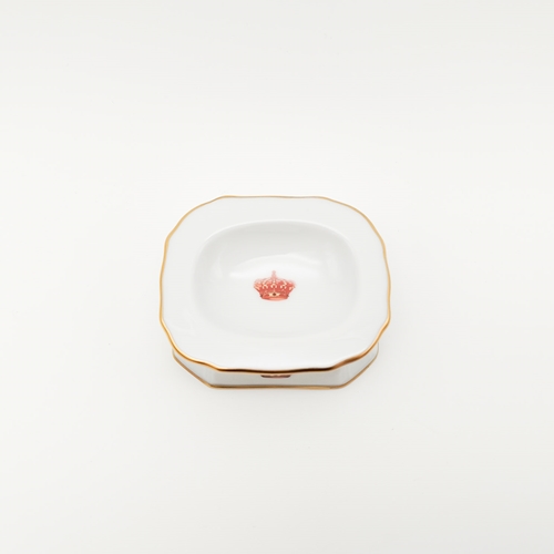 Em porcelana branca, em formato retangular, com coroa real a dourado, vermelho e verde e filete dourado no bordo.