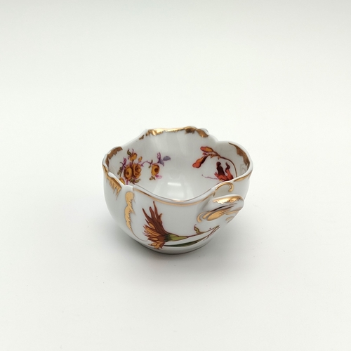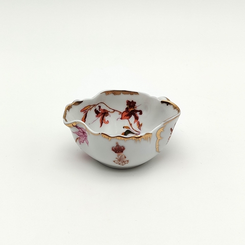 Cremeira polilobada em porcelana, com pequena asa lateral em forma de caule estilizado. Paredes interiores e exteriores com decoração polícroma e dourada, com composições de flores campestres e vegetalistas de diferentes cores e variedades, dispostas assimetricamente. Na parede exterior, monograma da rainha D. Maria Pia "MP" encimado por coroa fechada.